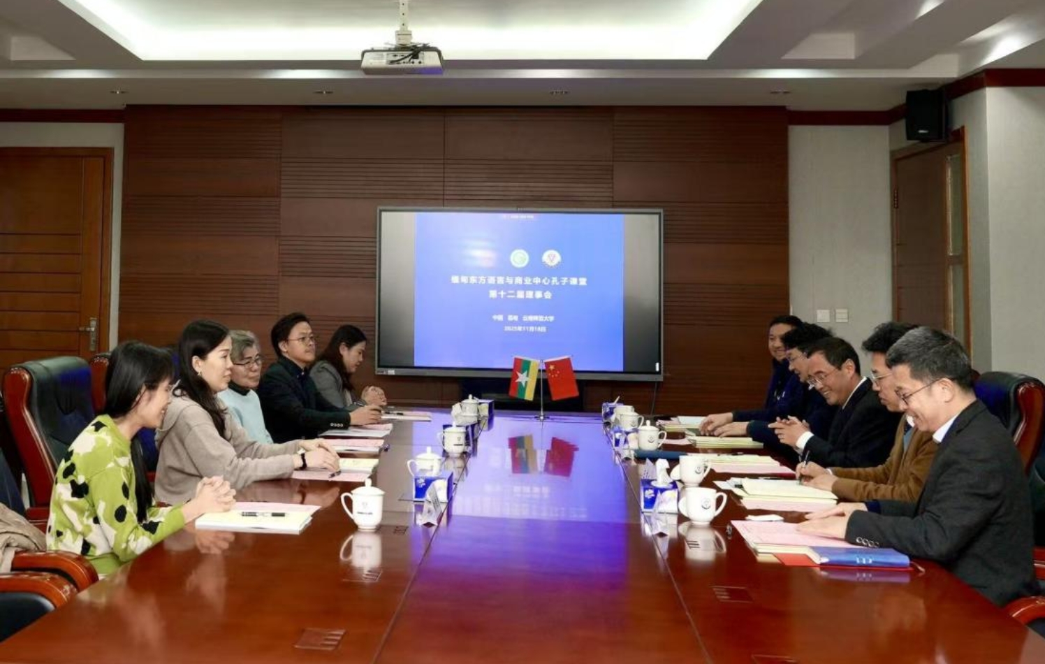 11月18日,缅甸东方语言与商业中心孔子课堂第十二届理事会在学校呈贡校区行政楼召开。副校长陈飞,云南华文学院党委书记陈永荣、院长王秀成,对外合作交流处处长杨叶华,孔子课堂中方负责人施银宝作为中方理事参会;缅甸东方学校董事长李丽清、孔子课堂缅方负责人曾圆香、中文部校长王崇喜、行政总监黄碧杏、人事总监黄维美作为缅方理事参会。会议由杨叶华主持。